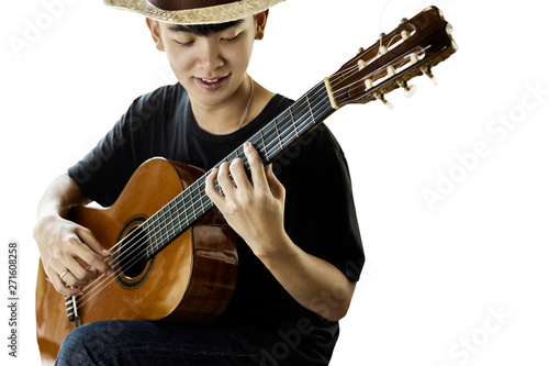 Obraz premium Asian man playing classic guitar isolated on white background in high contrast.