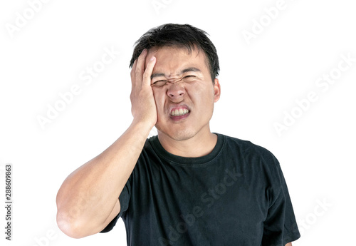 © scentrio, Naklejka premium Asian man suffering from headache wearing black t-shirt isolated on white background.