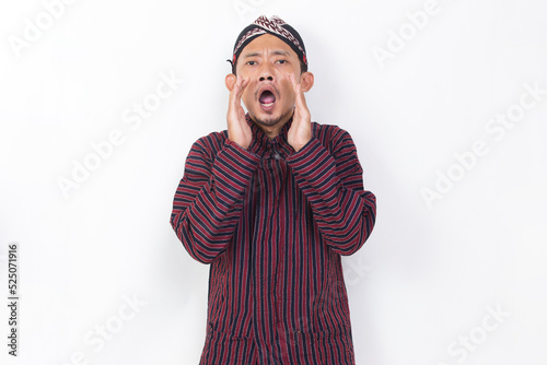 Fototapeta premium asian man with javanese traditional cloth lurik shouting and yelling announcing isolated on white background