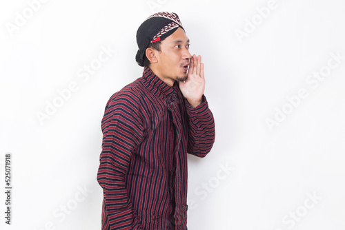 © dwi, Fototapeta premium asian man with javanese traditional cloth lurik shouting and yelling announcing isolated on white background