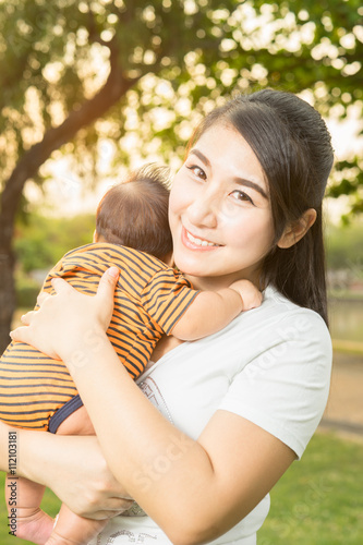 © amnadbumrungvong, Fototapeta premium asian 2 months baby feeling happy and smiles with her mother in