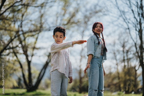 Fototapeta premium Asian mother and her son enjoying quality time together outdoors amidst...