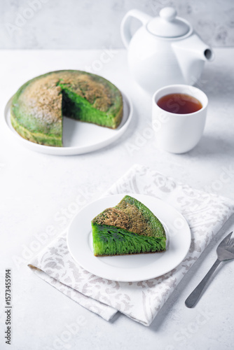 © nata_vkusidey, Naklejka premium Asian pandan green cake in a plate