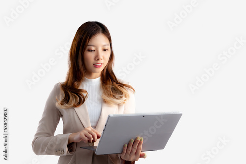 Fototapeta premium Asian pretty businesswoman holding notebook touching screen white background.