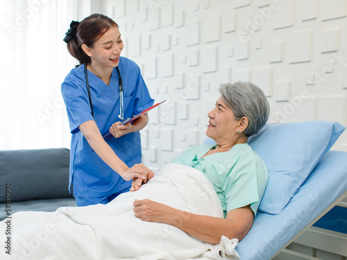© Bangkok Click Studio, Obraz premium Asian professional successful female internship nurse in blue uniform with stethoscope visiting old senior elderly pensioner woman patient laying lying down on bed writing symptoms down on clipboard