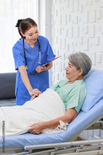 © Bangkok Click Studio, Obraz premium Asian professional successful female internship nurse in blue uniform with stethoscope visiting old senior elderly pensioner woman patient laying lying down on bed writing symptoms down on clipboard