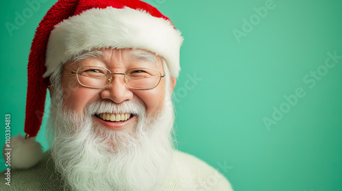 © Ron, Naklejka premium Asian Santa Claus with Glowing Smile and Bright Red and White Hat on Light Mint Green Background for Seasonal Promotions