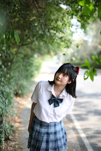 © Oran Tantapakul, Naklejka premium Asian school girl walking and looking in urban city with tree background