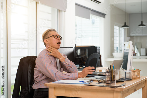 Obraz premium asian senior business man neck pain at work