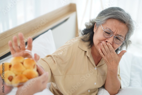 Fototapeta premium Asian senior woman raised her hand to refuse bread from caregiver