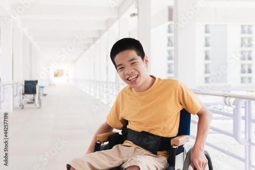 © GAYSORN, Obraz premium Asian special child on wheelchair is smiling face as happiness on ramp for disabled people background in hospital, Lifestyle in the education age of disabled children, Happy disability kid concept.