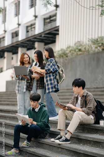 © Nuttapong punna, Fototapeta premium Asian Students are studying the campus park. Young people are spending time together. Reading book, working with laptop and tablet sitting on stairs