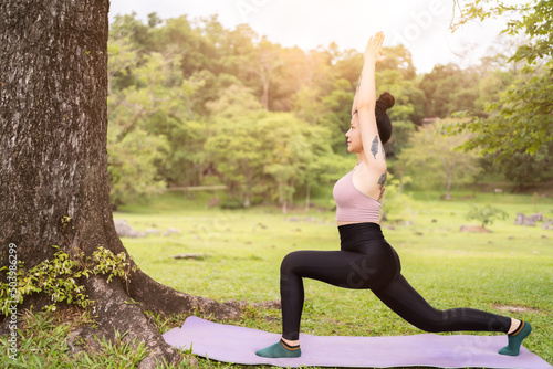 © wuanxiang, Fototapeta premium asian tattoo young woman doing yoga in the park