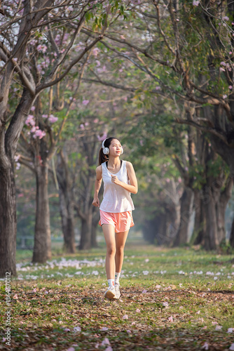 Naklejka premium Asian teenage girl jogging in a park in the morning.