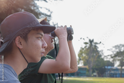 Obraz premium Asian teenboys learning nature by using binoculars to watch birds and insects...