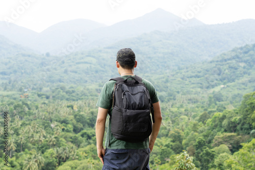 Naklejka premium Asian Traveler with Backpack Look through the Forest