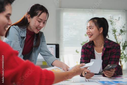 © Phimwilai, Obraz premium Asian web designers working together on user interface and user experience of mobile application are exchanging ideas and choosing color palettes