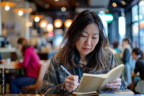 Obraz premium Asian Woman Concentrating on Journal Writing in Busy Cafe
