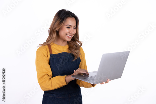 © Parichat, Naklejka premium Asian woman entrepreneur or shop owner holding a laptop computer with an excited face. isolate on a white background.