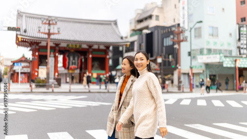 © CandyRetriever , Fototapeta premium Asian woman friends crossing street crosswalk with crowd of people during travel together at Asakusa, Tokyo, Japan in autumn. Attractive girl enjoy urban outdoor lifestyle travel on holiday vacation.