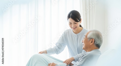 © Anna, Fototapeta premium Asian woman gently adjusts blanket with warm smile for elderly man