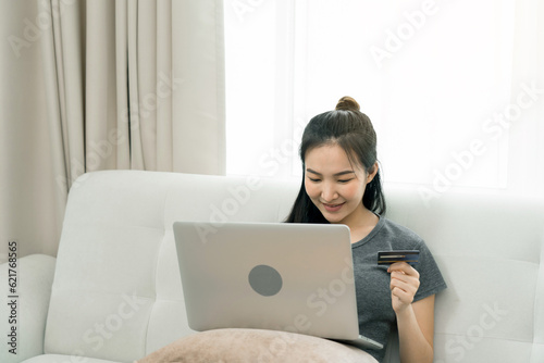 Naklejka premium Asian woman holding a credit card for online shopping while sitting on the couch while on vacation at home.