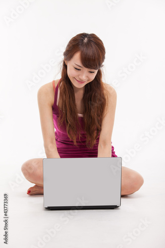 © 현수 김, Naklejka premium Asian woman lying down with laptop isolated on white background.