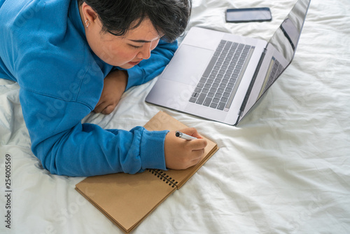 Naklejka premium Asian woman lying on bed and writing diary