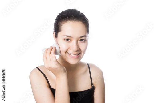 Fototapeta premium Asian woman massage her face with spa herbal ball isolated on wh