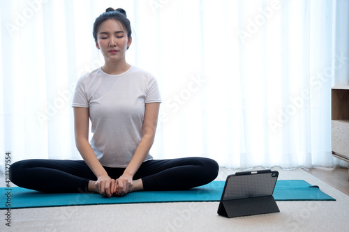 © sabthai, Fototapeta premium Asian woman play yoga on the map in her home