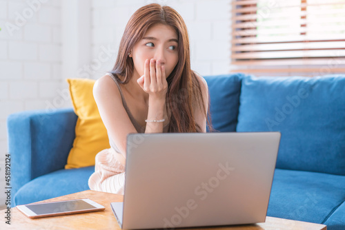 Fototapeta premium Asian woman relaxing sitting on sofa using computer notbeook at living room,...