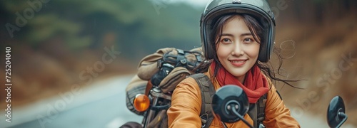 © tongpatong, Obraz premium Asian woman riding a motorbike with a rucksack and a smile
