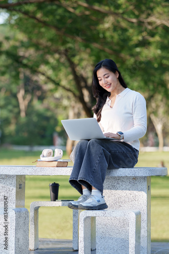 © Phimwilai, Obraz premium Asian woman studying online using laptop outdoors