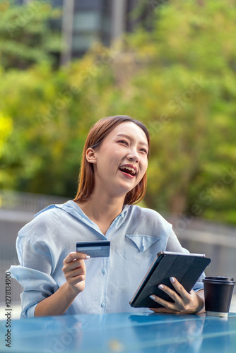 Fototapeta premium Asian Woman Using Tablet and Credit Card Outdoors a Modern Greenery Office...