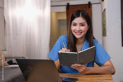 © PHAISITSAWAN, Fototapeta premium Asian woman with a beautiful smile and face sits comfortably on her desk at home with a laptop and notebook for relaxing and relaxing in a bright morning. holiday vacation concept.