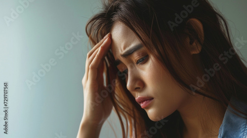 Obraz premium asian woman with a headache touching her forehead in pain