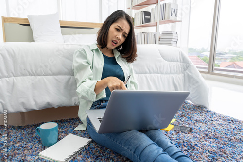 © SKW, Naklejka premium Asian woman working at bedside in bedroom at home with her tablet