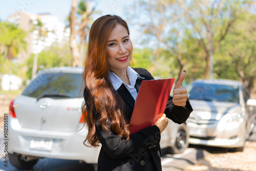Fototapeta premium Asian women are insurance agents holding clipboards and standing in front of...