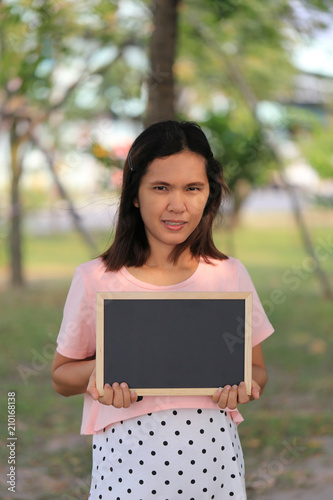 Fototapeta premium Asian women are pregnant for about twelve weeks to holding a blank blackboard.