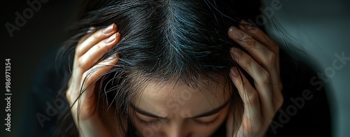 © kazitafahnizeer, Fototapeta premium Asian women facial problem A contemplative moment capturing a woman in distress, emphasizing emotion and reflection in a dimly lit environment.
