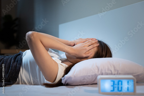 © Pormezz, Obraz premium Asian women opened eyes lying on the bed have an insomnia problems.