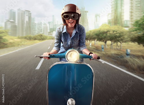 © Leo Lintang, Fototapeta premium Asian women riding a blue scooter