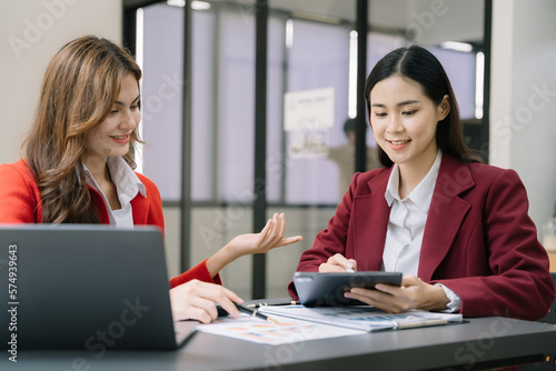 Fototapeta premium Asian women team brainstorming and discussing with financial data and report...