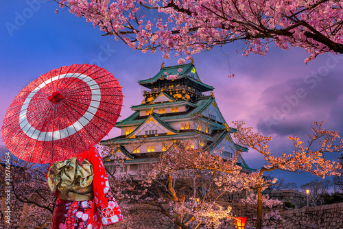 Fototapeta premium Asian women wearing kimonos See cherry blossoms in the evening around the Osaka Castle, Japan.