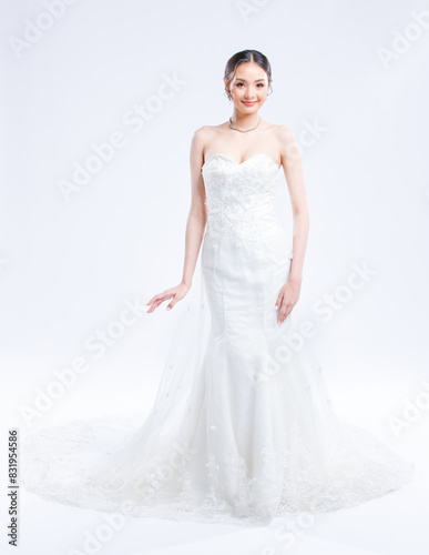 © Bangkok Click Studio, Fototapeta premium Asian young beautiful female portrait attractive model of bride wearing fashion wedding dress, luxury delight make-up, hairstyle, standing looking camera isolated white background studio indoor photo