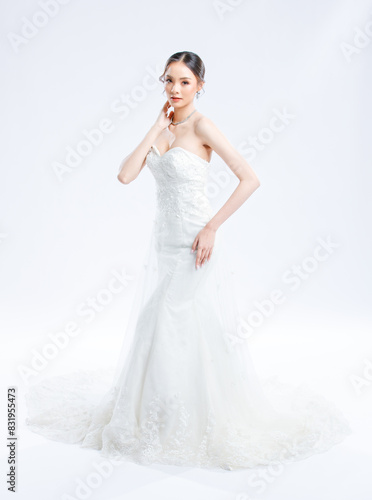 Fototapeta premium Asian young beautiful female portrait attractive model of bride wearing fashion wedding dress, luxury delight make-up, hairstyle, standing looking camera isolated white background studio indoor photo