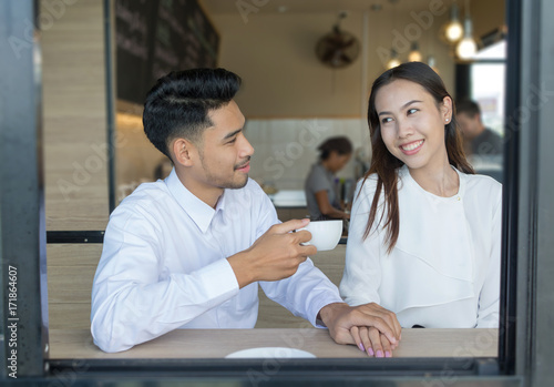 © Nawarit, Obraz premium Asian young couple in love at a coffee shop