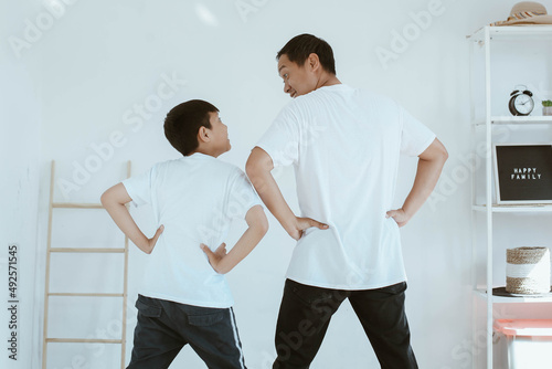 Fototapeta premium Asian young father in white t shirt and his son in white t shirt are showing their backs while looking at each other with silly expression, spending time together at home