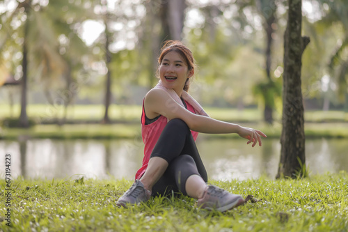 Naklejka premium Asian young women enjoy exercising in the public park. Stretching the body and taking a breath of fresh air. The fresh air helps to feel more energized.