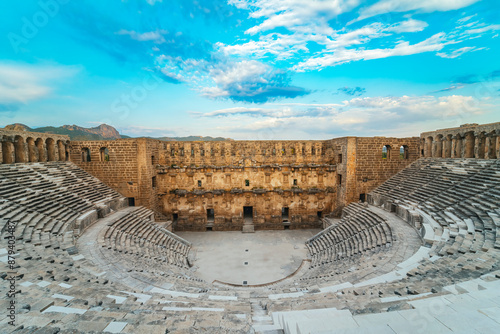Naklejka premium Aspendos, Antalya. Wide-angle panoramic view of the Roman Theater in Turkey,...